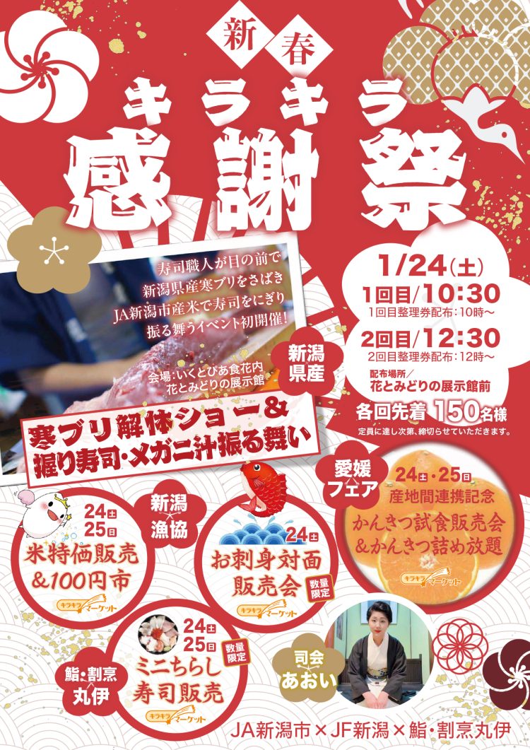 新年を迎えました。 本年も何卒よろしくお願い申し上げます。 1/24(土) いくとぴあ食花内にて「ブリの解体ショー&握り寿司・メガニ汁振る舞い」 が行われます! 握り寿司は「鮨...