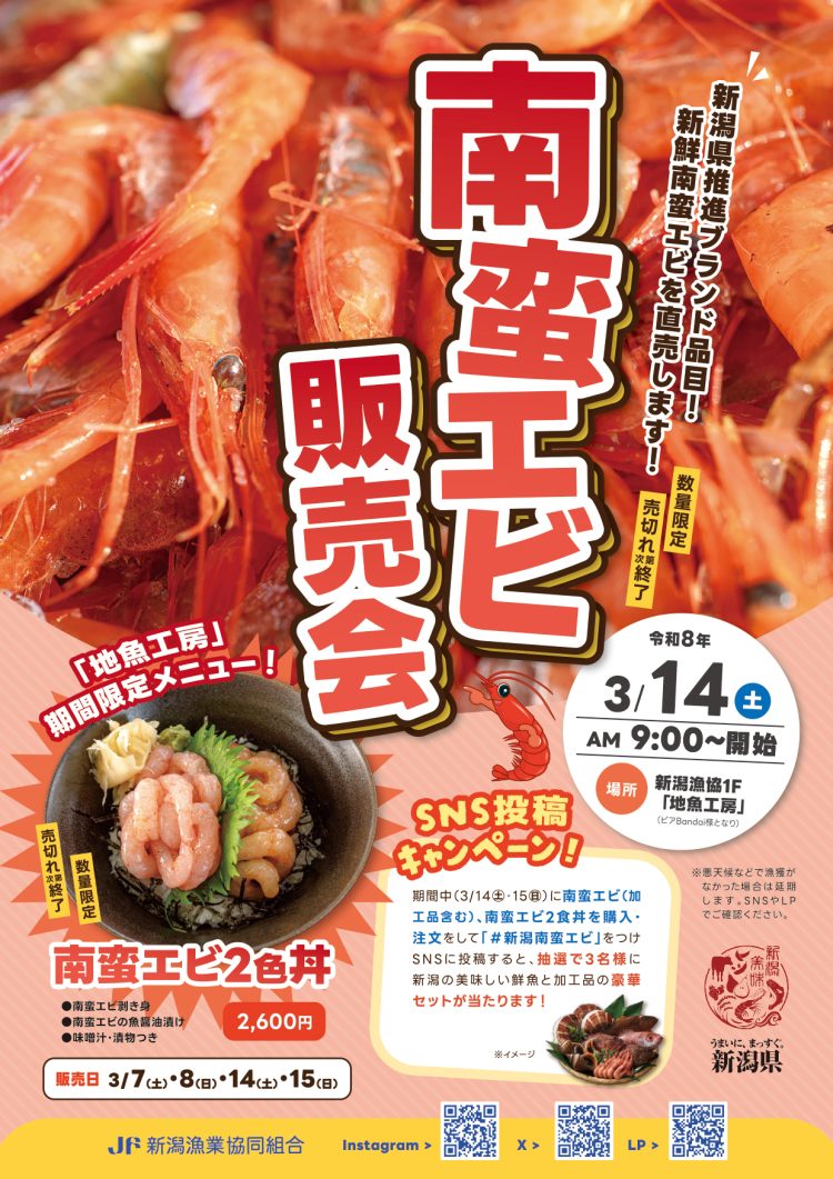 この時期の美味しい新潟の名産品「南蛮エビ」・・・! 今年も新潟漁協 南蛮エビ直売会を開催いたします! 3/14(土) am9:00から 地魚工房前にて ※売り切れ次第終了です ※漁獲によ...