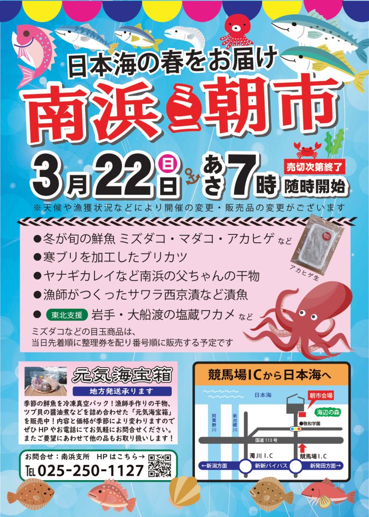 3月の南浜朝市は3/22(日)です! 水ダコ、真ダコなどのタコ類、そして冬の妖精[赤ひげ]もおすすめに上がっています。 当日の漁獲次第ではありますが、美味しい地元の味です。 ぜひお買い求めにいらしてく...